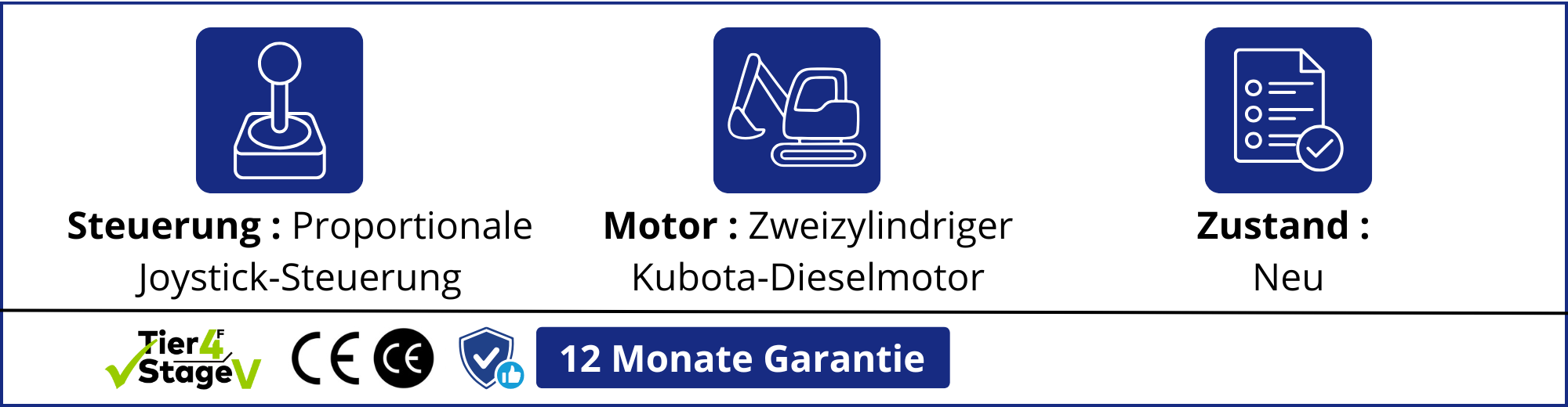 Ausgestattet mit einem zuverlässigen Kubota-Dieselmotor, überzeugt die R13 PRO durch leisen Betrieb, niedrigen Kraftstoffverbrauch und hohe Lebensdauer. Mit einer maximalen Grabtiefe von 2,10 m und einem Betriebsgewicht von 1.300 kg bewältigt sie auch anspruchsvolle Arbeiten mühelos.